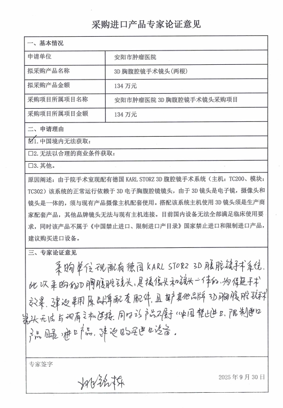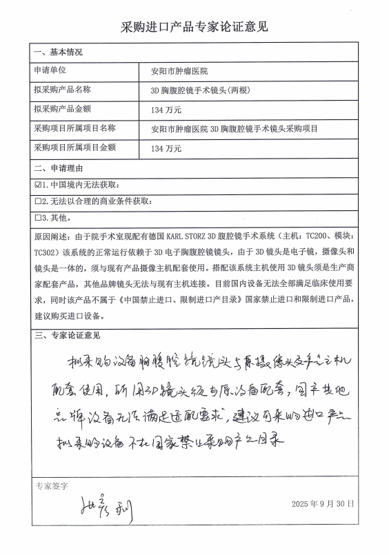 1、项目名称:安阳市肿瘤医院3D胸腹腔镜手术镜头采购项目