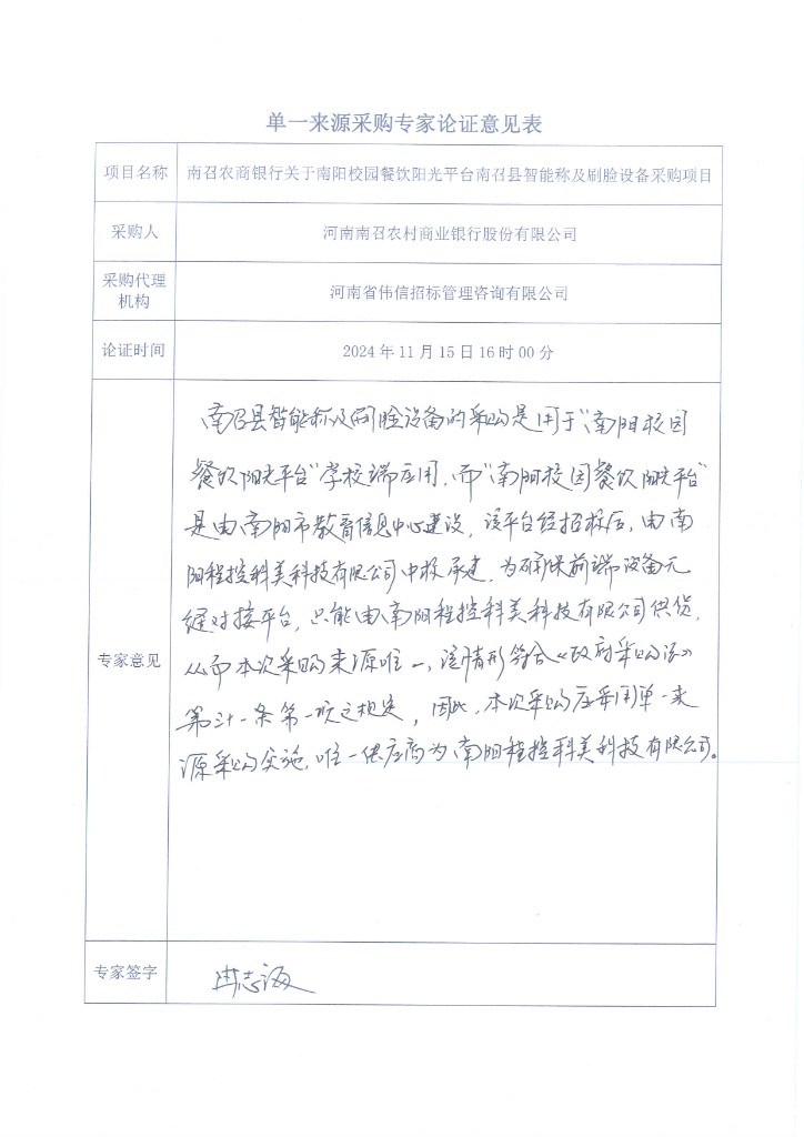 为促进我行业务发展,根据中共南阳市纪律检查委员会、南阳市监察委员会、南阳市教育局联合发布的《关于拟建设“南阳市校园餐饮阳光平台”情况报告》要求,我行承担南召县校园餐饮阳光平台建设项目。经考察查证,2024年08月15日南阳市教育信息技术服务中心已对“南阳市校园餐饮阳光平台建设开发服务项目”进行了招标,中标人为南阳程控科美科技有限公司,该公司负责该项目的开发建设、更新升级及后续运维工作。在本项目中,智能收货终端及人脸识别终端作为关键硬件组成部分且需与平台系统实现无缝对接、互联互通,以确保食材收货流程的顺畅与稳定。南阳程控科美科技有限公司的智能收货终端及人脸识别终端已经过测试,并与“南阳市校园餐饮阳光平台”系统实现了完美对接。这些设备在功能、性能及接口标准上均符合平台要求,具有高度的兼容性和稳定性。为确保项目实施的连续性和稳定性,避免因设备更换带来的技术风险和时间成本,依据“《中华人民共和国政府采购法》第三十一条(一)只能从唯一供应商处采购的;”规定,本项目拟采用单一来源采购方式进行采购。
